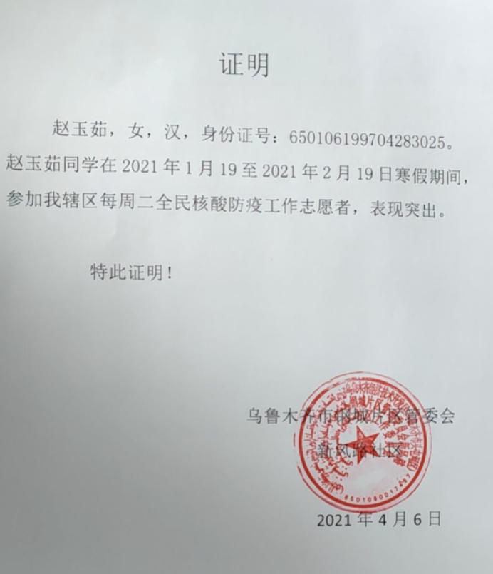 1月中旬,刚刚返回家乡,两个小时的时差没能挡住矿物学QX201班赵玉茹同学做志愿者的热情。在一个月的志愿工作时间里,社区300余名居民需要开展4次核酸检测,时间紧任务重,作为3名核酸检测工作队中的一员,她在参加培训后,每天上午九点,就早早地来到新疆社区服务中心穿上防护服开始工作。“请大家排好队,一个一个来进行检测,不用着急。”赵玉茹指挥着前来做核酸检测的居民,同时耐心介绍核酸检测的流程。“大家看这个示意图,等下我会用棉签在喉咙沾几下,可能会有些不舒服,请大家忍一忍,免得伤到喉咙。”赵玉茹善意地提醒着。取咽拭子、检测场所消杀、为检测阴性的居民在出入证明上盖章......穿着厚厚防护服的她,每天脱下时,里面的衣服常是湿透的,一个月下来,本就清瘦的她又瘦了几斤。为此,她表示,在国家最需要我们的时刻,总有人要冲在最前面,作为当代老员工,虽是父母眼中的“弱女子”,但责无旁贷,必须挺身而出。