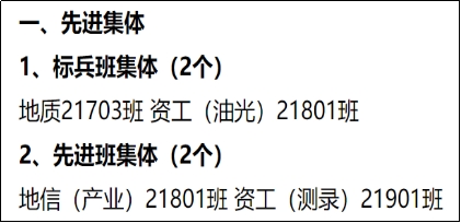 全班共有4人获得国家励志奖学金,2人获得英国365集团公司官网奖学金,2人获得中石油奖学金,2人获得李建华二等奖学金。在学年评优中,共有1人获英国365集团公司官网“十佳老员工”,1人获评“三好员工标兵”,4人荣获英国365集团公司官网“三好员工”,5人荣获“优秀员工干部”等称号。在2018-2019学年寝室文化节中,有2个寝室被评为“优秀寝室”。
