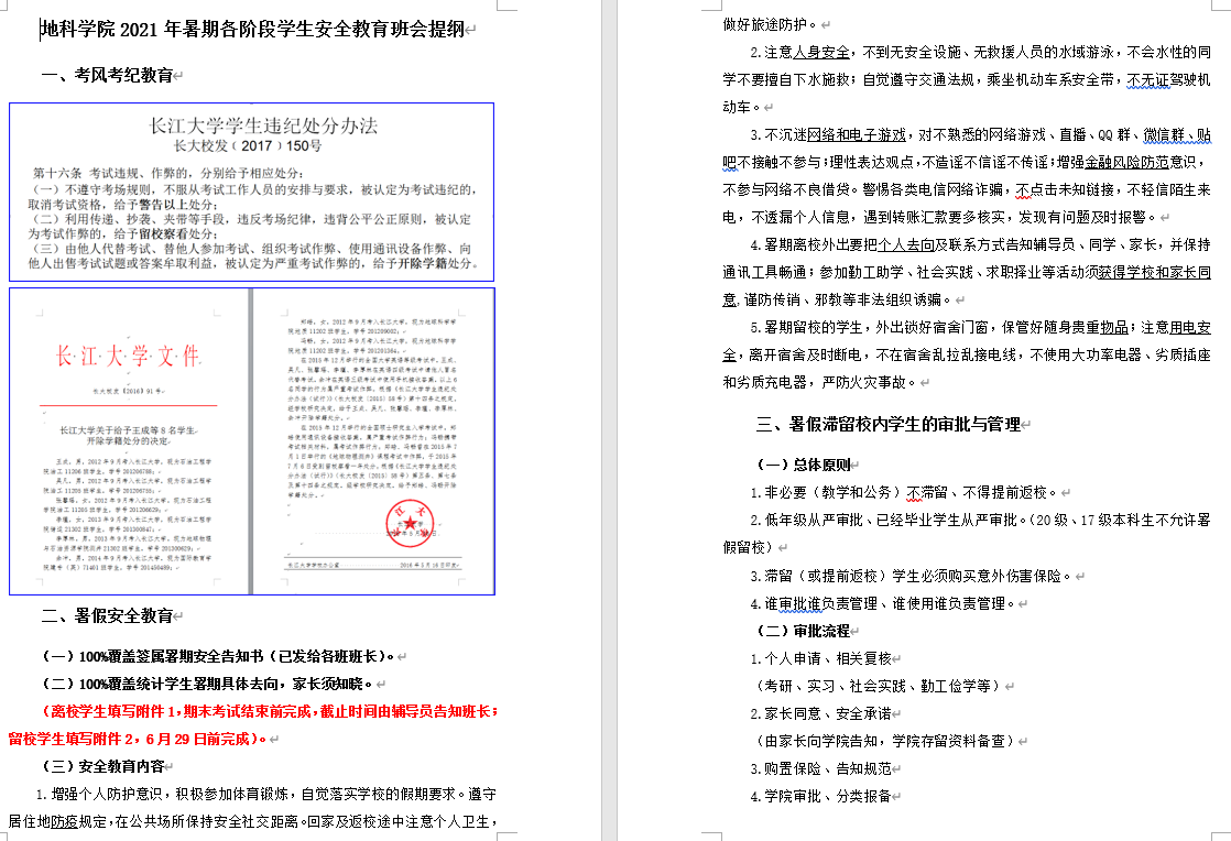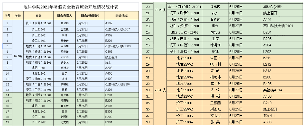 6月23日,学工办全体老师集中对暑期各阶段员工安全教育工作的方方面面进行了梳理,就重难点工作进行了具体安排与分工,并拟定《地科公司2021年暑期各阶段员工安全教育班会提纲》进一步保证班会效果。6月24日,各辅导员分年级组织召开了班长及安全员会议,重点讲解了安全教育班会的内容,并对如何开好班会及各类资料的收集进行了一一说明。