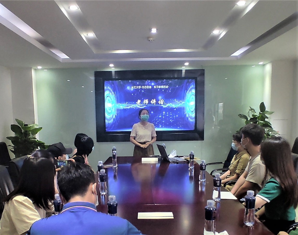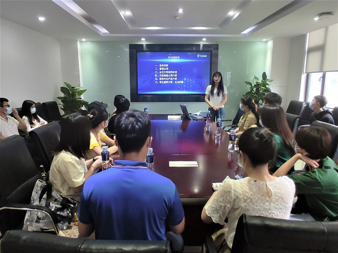 参观完整洁的办公环境,同学们一起来到了四楼会议室。郭霖老师首先对光谷信息提供的机会表示感谢,并为公司良好的企业氛围和办公环境点赞;她希望同学们借助今天这个机会,带着专业的疑问和对未来规划的思考用心地来进行交流。接着,她提出了同学们要实现三个转变:“第一是要实现从公司学习的知识到和实践相结合的转变,要能够理论联系实际;第二是要实现从员工到职业人的转变,尽快改变观念去适应工作;第三是要实现从一个普通公民到社会人的转变,承担起自己的社会责任。”她寄语:“同学们要把自己的命运和国家联系到一起,要立大志、长志,争取为公司、为行业、为祖国增光添彩。”