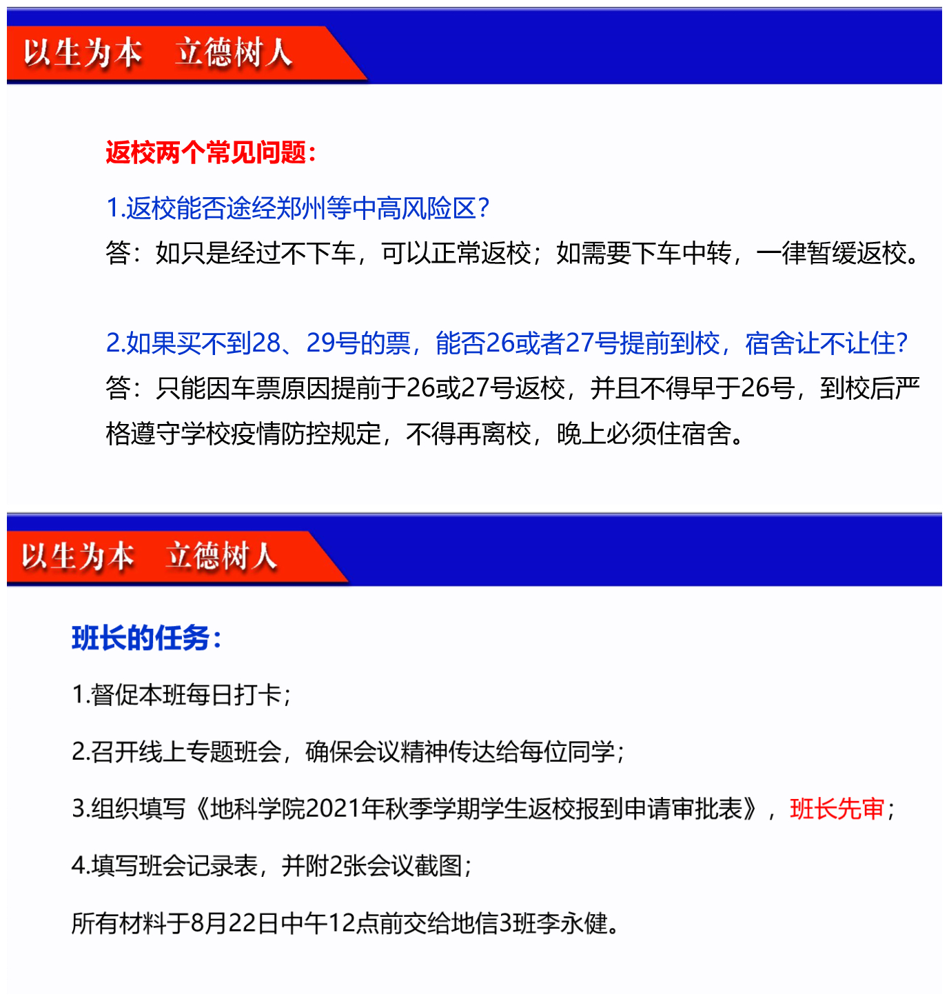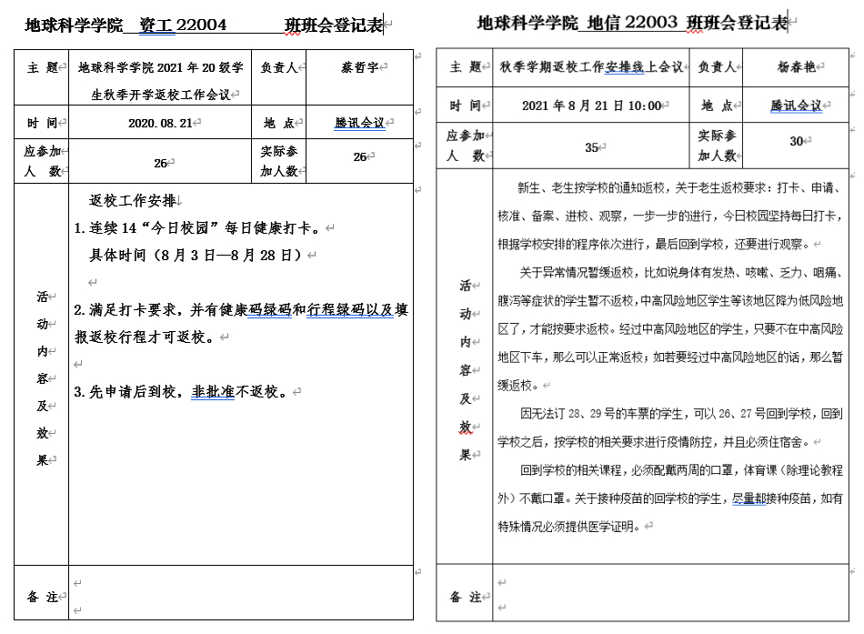 主题班会由各年级辅导员负责,并分两步进行。第一步先由各辅导员组织召开班长及安全员会议,会议主要从返校流程要求、常见问题、疫苗接种、日常防护等方面展开。重点强调了要严格遵守公司的疫情防控及开学返校工作要求,不得私自返校;同时要求坚持每天打卡,非必要不出门,保证自己的健康绿码和行程绿码,积极接种疫苗。第二步由各班班长组织召开班级会议,确保公司及公司疫情防控及返校工作精神无一遗漏传达给每位同学,并组织同学们填写返校申请审批表。