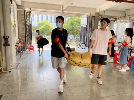 9月4号上午是报道高峰期,37℃的骄阳挡不住员工党员为新生服务的热情与激情。10时许,党委副书记任倩来到4栋时,看到党员们的T恤都已经湿透,问起他们,资工22004班蔡哲宇摆摆手“两个小时内,我跑了七趟6楼,就当锻炼啦”。女生衣物行李较多,常常需要“四对一”甚至“六对一”“八对一”服务。但大家没有叫苦喊累,而是主动服务,送到对应的寝室门前。测绘QX211班钟康说,“天气虽热,服务不能打折。一个党员就是一面旗帜,胸前的党员徽章,手臂上的红袖章,地科院的志愿者们就是开学季最美丽的风景线!”