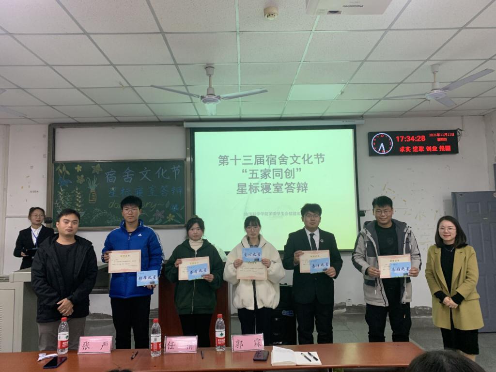 活动进行到最后一项,经过评委们深思熟虑的考量和公平公正的评判,以及现场观众的参与投票,从16个寝室的激烈竞争当中,五个星标寝室脱颖而出,他们是:书香之星——校内四栋333;洁净之星——华林九栋524;爱心之家——校内四栋220;乐雅之星——华林九栋607;持律之星——华林九栋320,由张严老师和郭霖老师为他们颁奖。