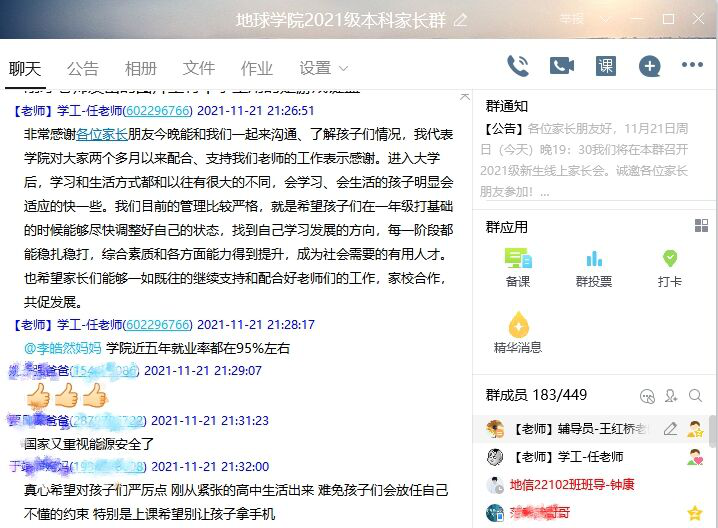 (通讯员 周再文)为加强家校沟通,形成育人合力,11月22日晚19:30,公司通过QQ群召开新生线上家长会。公司党委副书记任倩以及年级辅导员王红桥、300余名员工家长参会。