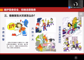 接下来,由地物公司荆鑫老师讲解有关防盗、防火、防溺水的注意事项。他以校区曾发生的真实事故,让同学们有了更真切的感性认识,并提醒同学们积极参加校区消防演习,了解逃生常识,对违规电器等可能引发事故的危险因素保持警觉。