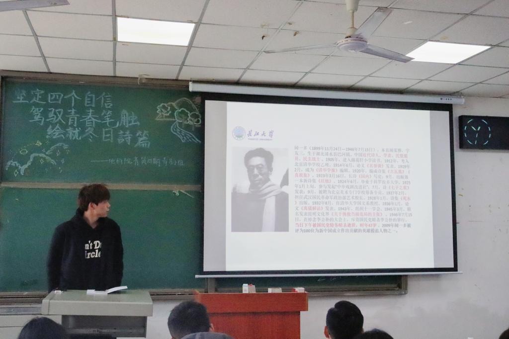 来自东北黑土地的关梅堃同学展示了她参观东北烈士纪念馆、刘少奇革命遗址、哈尔滨烈士陵园等地的照片,一座座红色地标,记录着催人奋进的革命故事,也彰显着红色文化的世代传承。点点星火,凝聚无限力量。白山黑水,燃起抗日烽火。朱永康介绍了家乡无产阶级革命战士闻一多先生的事迹,语言生动、情感真挚,令人动容。曹莹心则自信大方地向大家展示了家乡淄博的传统文化,从美食到手工艺品,从戏曲到古建筑。同时淄博也是去年火出圈的“网红城市”,她热情地欢迎大家来到热情、好客、纯朴、大气的山东淄博。