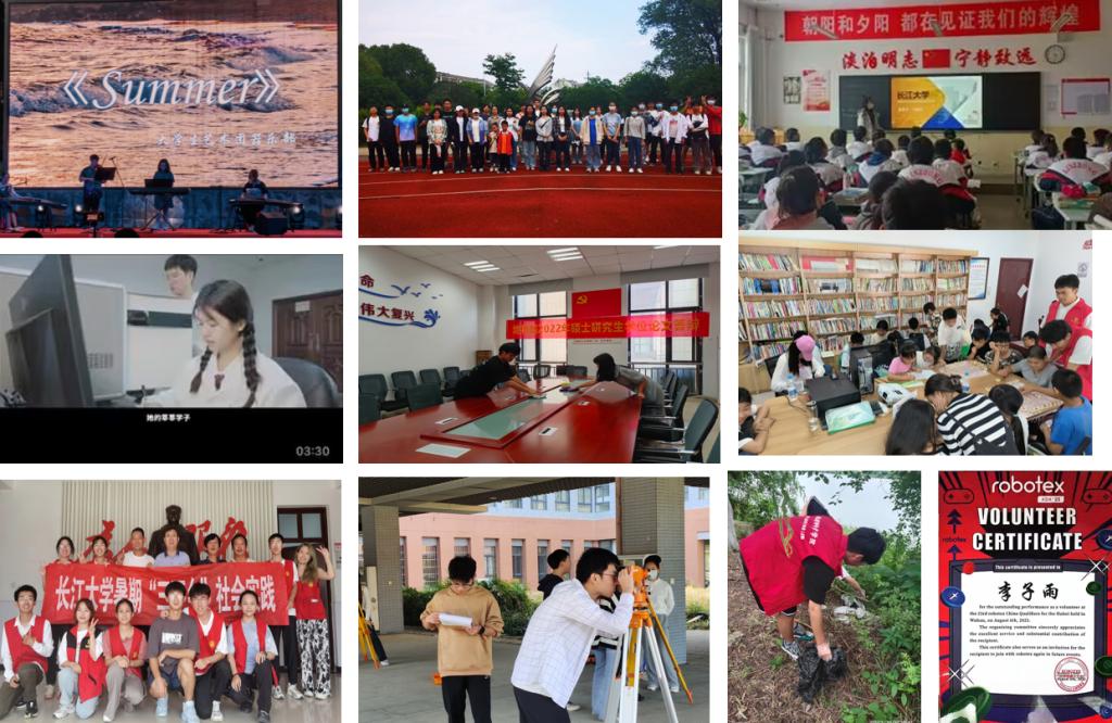 同时大家积极参与社会实践活动、志愿活动,如组织策划能源文化节闭幕式表演、参加姚家林小学支教活动、多次组织参与各项羽毛球比赛并担任主裁、回访母校宣讲、代表地科院参与公司的百生讲坛总决赛、作为地科院员工代表出席英国365集团公司官网第五次员工代表大会、参与20年校庆视频拍摄、办公室卫生打扫、校园清扫、暑期三下乡社会实践、担任第23赛季Robotex湖北省赛区武汉站的志愿者、2023级新生迎新、受邀给全体地科院同学进行暑期社会实践宣讲等。