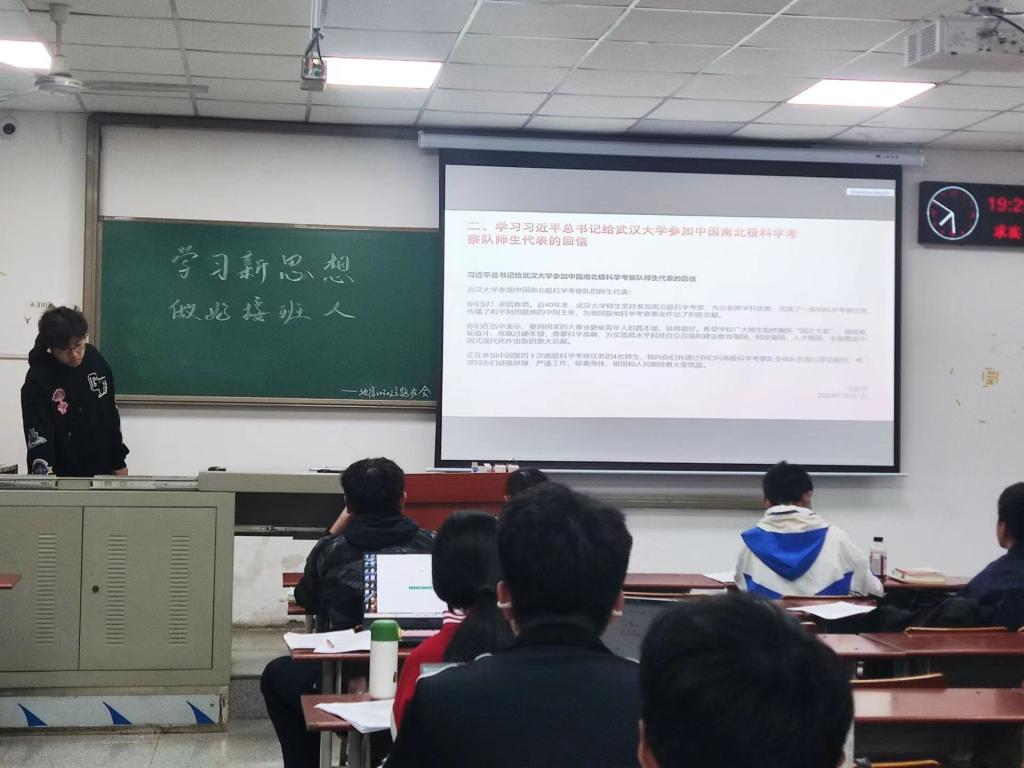首先,团支书杜明霖向大家介绍了本次团会的流程,让大家了解了本次团会开展的目的与意义。接下来,杜明霖通过展示相关资料,代领同学们学习了2024年基层团组织主题团日活动指引。让同学们认识到,加强政治思想觉悟,坚定听党话、跟党走的重要性。随后,杜明霖带领大家学习了习近平总书记给“武汉大学参加中国南北极科学考察队师生代表”的回信,大家明白了作为新时代的青年,我们担当着新的责任和使命,要苦学基本功、锤炼真本领,将“小我”成长融入“大我”奋斗之中,为全面推进中国式现代化作出新的更大贡献。最后,同学们集体进行了“青年大学习”网上主题团课的学习。