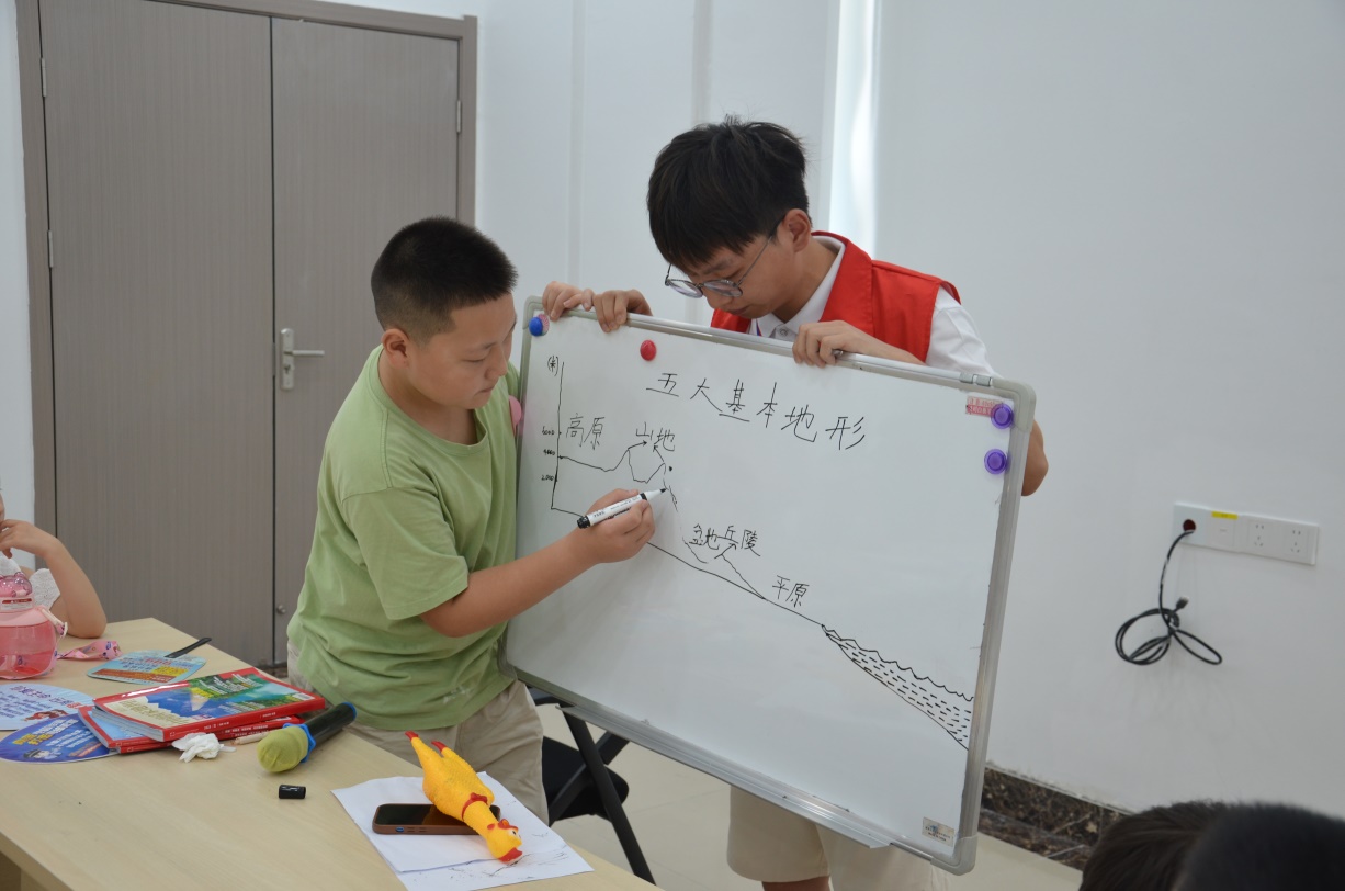 如何将枯燥的地学知识讲得生动有趣,实践队志愿者们可花了不少心思。11名实践队员集体备课,挑选孩子们感兴趣且与生活贴近的知识点,提前准备教学道具和实验用品,还精心设计教学内容和环节,力求达到寓教于乐的目的。第一场基本地形科普课上,实践队员戴佩为孩子们讲授完知识点后,马上邀请几个不同身高的孩子上台,分别扮演高原、平原、山地、丘陵和盆地,孩子们在形象有趣的游戏中,一下子就将五大基本地形深深地记在脑子里。“老师们讲的太有趣啦,让我轻松理解了这些地理知识,真的还想再多上几节地质科普课!”初一年级的员工张宇轩激动地说。