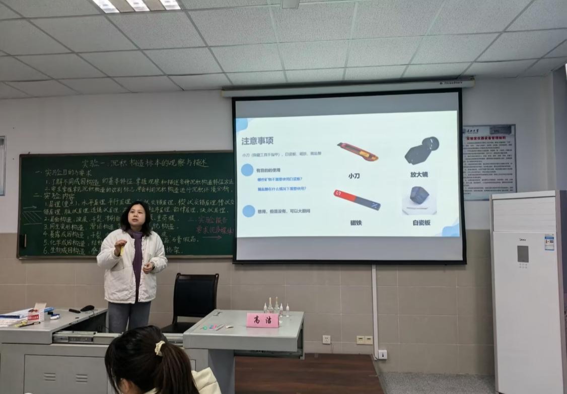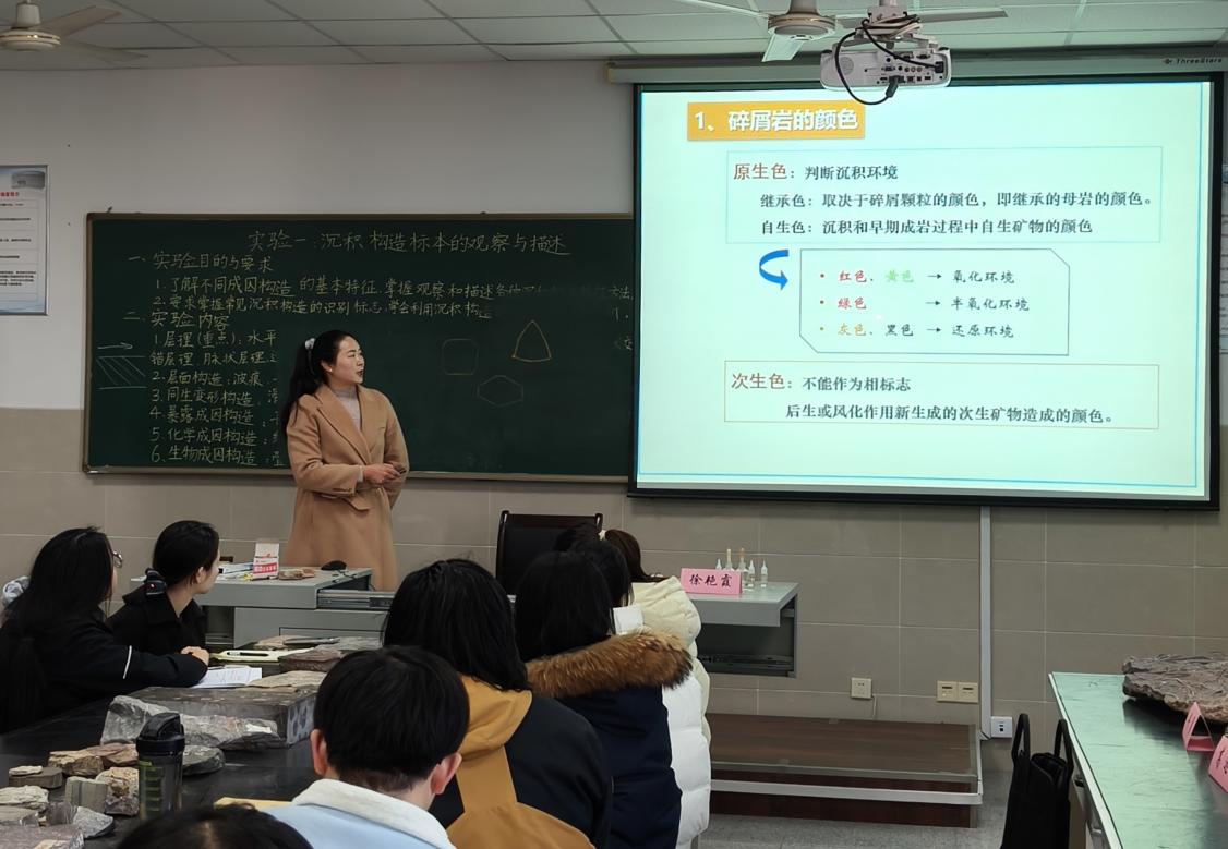徐艳霞老师以《沉积岩(陆源碎屑岩类)鉴定技巧》为题,解释了地球上三大岩类与岩石循环过程,着重讲解了碎屑岩的成分、构造及观察方法,并带领同学们现场识别一系列砂岩手标本。
