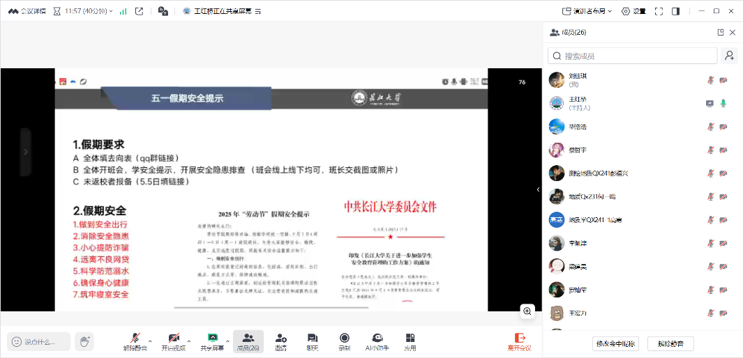 会后各班班委在班级组织安全教育班会,传达公司“五一”假期安全提示,做好安全教育。公司领导带队检查宿舍、实验室、自习室等场所,排查安全隐患。