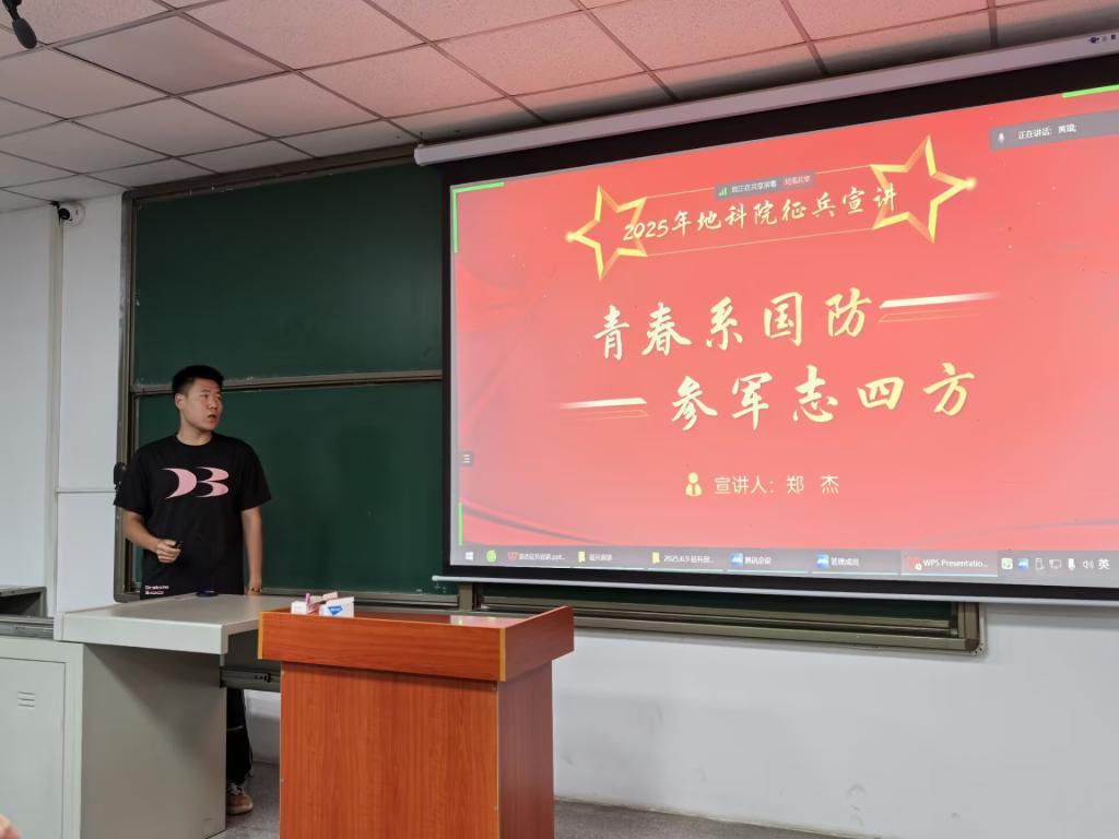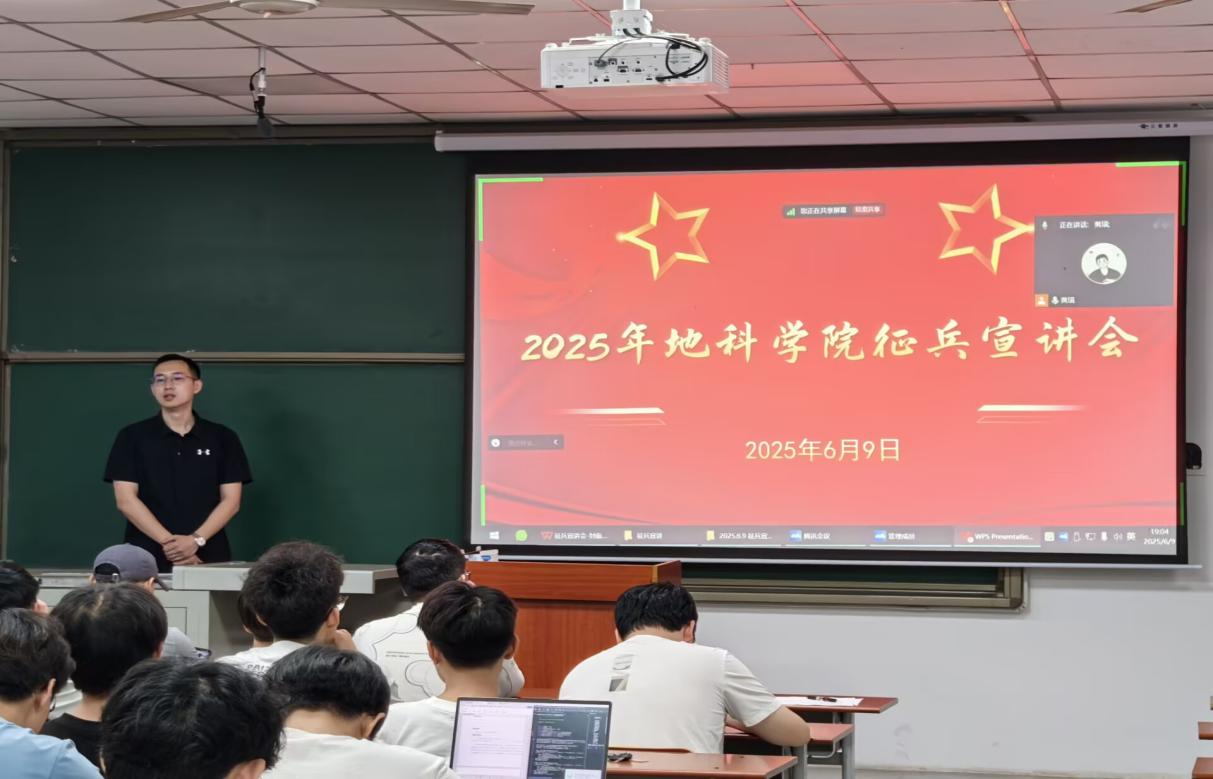 (通讯员 刘佳琪 摄影 李雨泽)为响应国家号召,激发公司员工参军报国热情,6月9日晚7时,2025年地科公司征兵宣讲会在武教B202以线上线下融合方式举行。会议由退伍士兵郑杰、朱正康担任主讲,辅导员黄瑱老师主持,400余名员工参与活动。