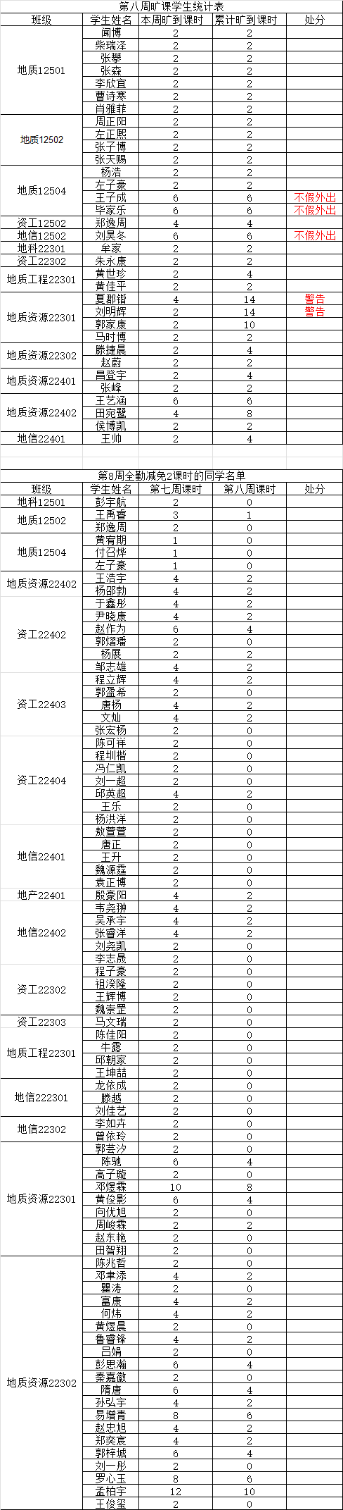 关于第八周课堂考勤的通报 为落实公司关于加强学风建设的相关要求,进一步规范课堂秩序,营造良好的学习氛围,公司持续开展常态化课堂考勤工作。现将第八周考勤情况通报如下: 一、旷课员工名单 二、相关说明 依据《积极分子动态管理办法》第五章,积极分子考察期内无故旷课取消身份。 依据《英国365集团公司官网员工违纪处分办法》,一学期累计旷课达到规定学时的,分别给予以下处分: 1. 旷课达到12学时,给予警告处分; 2. 旷课达到24学时,给予严重警告处分; 3. 旷课达到36学时,给予留校察看处分; 4. 旷课达到48学时,给予留校察看处分; 5. 旷课达到60学时,给予开除学籍处分。 注:若员工某周存在旷课记录,但次周所有课程均正常到课(无迟到、旷课),则可从该生累计旷课课时中减免 2学时。