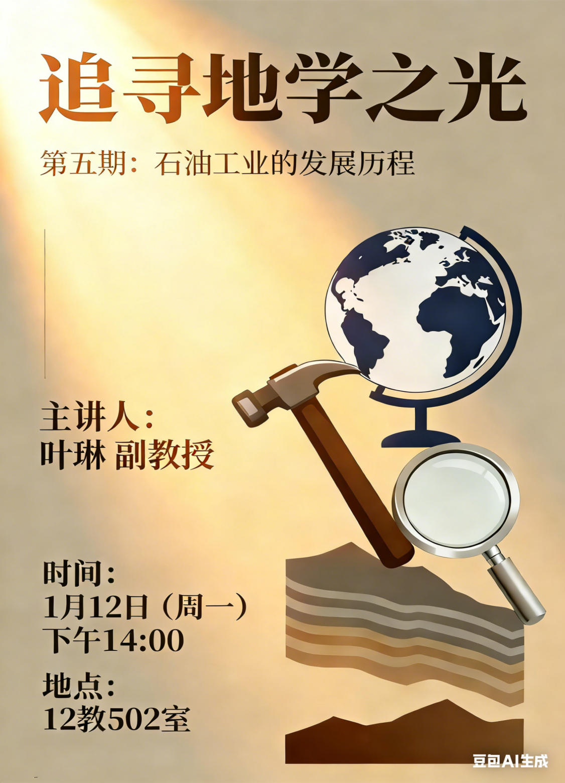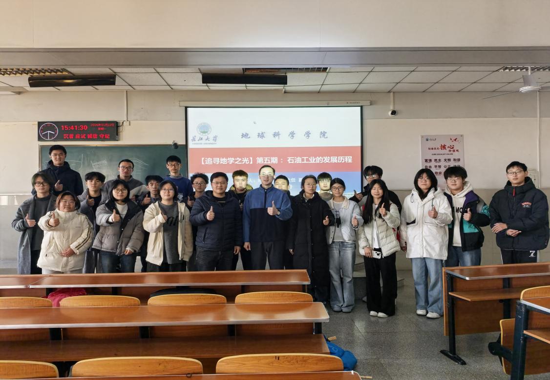 (通讯员 黄瑱 欧登波 徐泽文/摄)1月12日下午,在东校区12教502室,石油系主任叶琳副教授以“石油工业的发展历程”为题,开展了第五期“追寻地学之光”学术活动,全体2025级员工参加,活动由年级辅导员黄瑱主持。